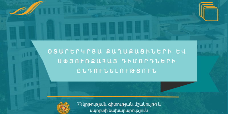 Հայաստանի Հանրապետության կրթության, գիտության, մշակույթի և սպորտի նախարարությունը (այսուհետ՝ Նախարարություն), հիմք ընդունելով Հայաստանի Հանրապետության կառավարության 2011 թվականի ապրիլի 28-ի «Հայաստանի Հանրապետության բարձրագույն ուսումնական հաստատություններ օտարերկրյա քաղաքացիների, ինչպես նաև օտարերկրյա պետություններում գործող Հայաստանի Հանրապետության դիվանագիտական ծառայության մարմիններում աշխատող դիվանագետների ընտանիքների անդամների ընդունելության կարգը հաստատելու մասին» N 700-Ն և ՀՀ կառավարության 2011 թվականի օգոստոսի 25-ի «Հայաստանի Հանրապետության նախնական մասնագիտական (արհեստագործական) և միջին մասնագիտական ուսումնական հաստատություններում օտարերկրյա քաղաքացիների ընդունելության կարգը հաստատելու մասին» N 1295-Ն որոշումները, սկսում է օտարերկրացի և սփյուռքահայ դիմորդների փաստաթղթերի ընդունումը՝ 2022-2023 ուսումնական տարում ՀՀ նախնական մասնագիտական (արհեստագործական), միջին մասնագիտական և բարձրագույն ուսումնական հաստատություններում ընդունվելու համար: